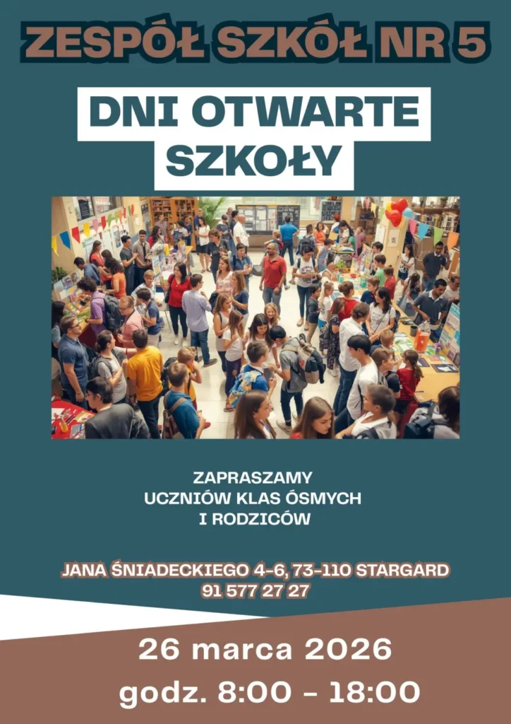Zespół Szkół nr 5 w Stargardzie zaprasza uczniów klas ósmych oraz ich rodziców na Dni Otwarte, które odbędą się w czwartek, 26 marca w godz. 8-18 w siedzibie szkoły przy ul. Jana Śniadeckiego 4-6.