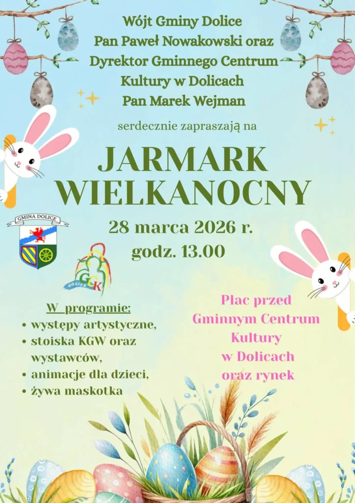Wójt Gminy Dolice Pan Paweł Nowakowski oraz Dyrektor Gminnego Centrum Kultury w Dolicach Pan Marek Wejman zapraszają na Jarmark Wielkanocny, który odbędzie się w sobotę, 28 marca o godz. 12, na Placu przed Gminnym Centrum Kultury w Dolicach.