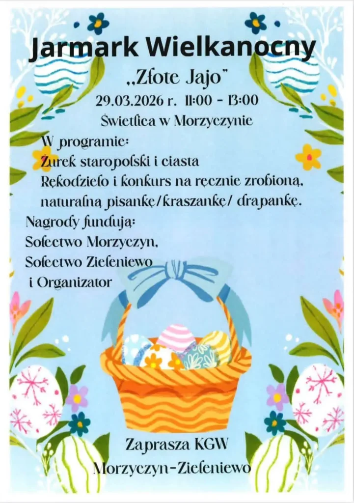 Sołectwo Morzyczyn zaprasza na Jarmark Wielkanocny „Złote Jajo”, który odbędzie się w niedzielę palmową, 29 marca w świetlicy w Morzyczynie.