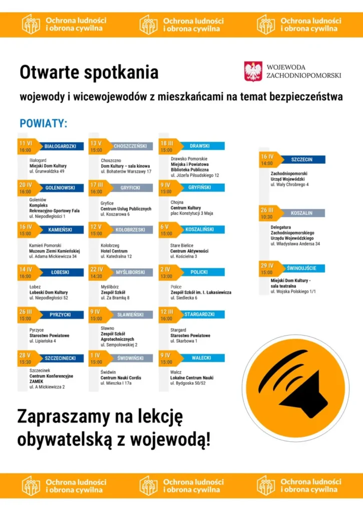 Wojewodowie Adam Rudawski, Bartosz Brożyński, wicewojewoda Zachodniopomorski i Dawid Krystek ruszają w region z cyklem otwartych spotkań z mieszkańcami. Taka lekcja obywatelska w Stargardzie odbędzie się 12 marca w starostwie o godz. 16.