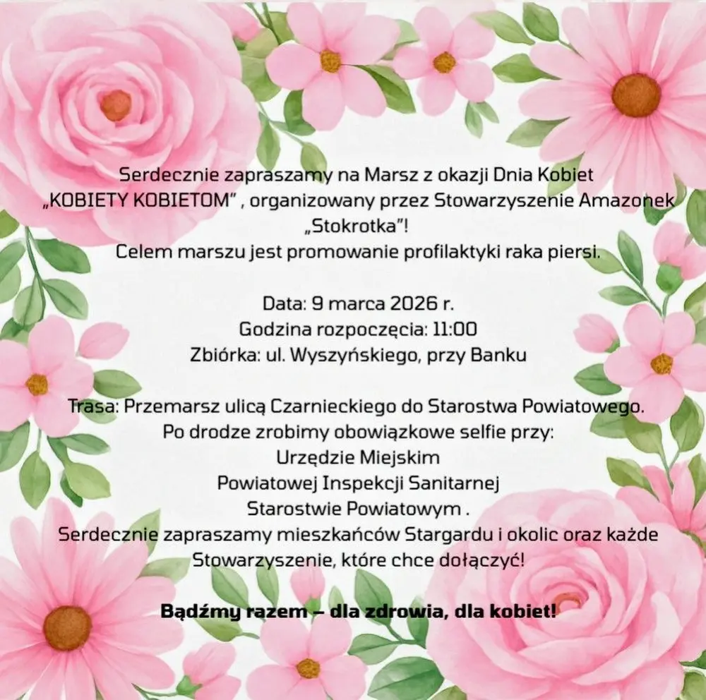 „KOBIETY KOBIETOM – idziemy razem dla zdrowia!” – z okazji Dnia Kobiet Stowarzyszenie Amazonek „Stokrotka” zaprasza na wyjątkowy marsz pełen solidarności, wsparcia i dobrej energii!. Odbędzie się on 9 marca.