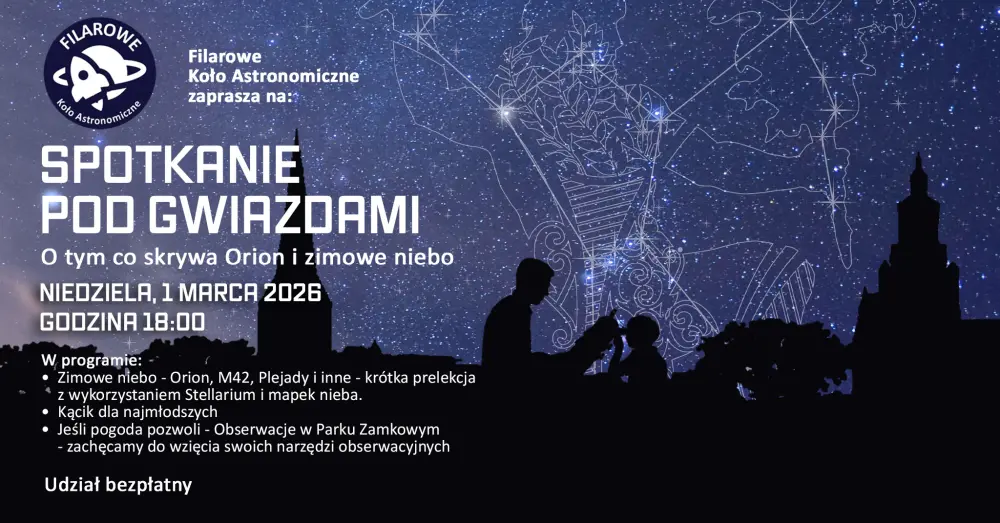 Podczas prelekcji przyjrzymy się najciekawszym obiektom zimowego nieba – Orionowi, Mgławicy M42, Plejadom i innym gwiezdnym perłom.
