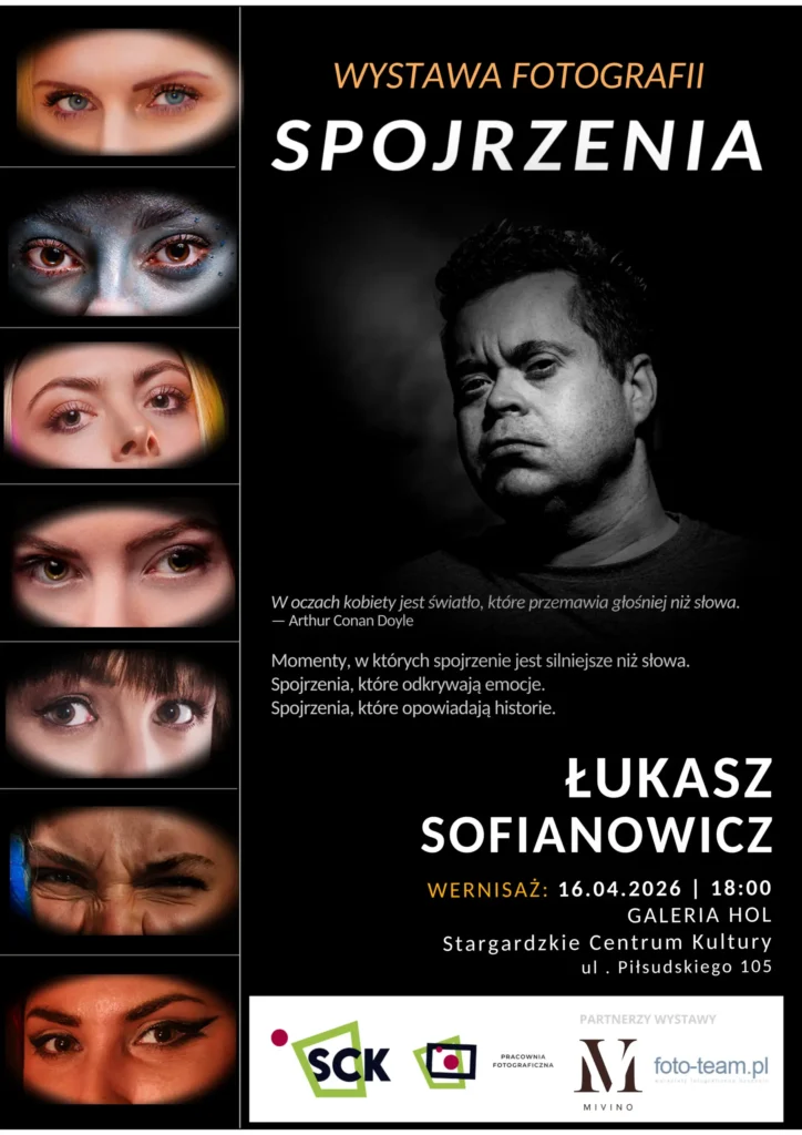 Stargardzkie Centrum Kultury zaprasza na wernisaż wystawy fotografii pt. „Spojrzenia”. Swoje prace zaprezentuje Łukasz Sofianowicz – fotograf związany z Pracownia Artystyczną SCK, który w swojej twórczości koncentruje się na portrecie i eksperymentach ze światem.