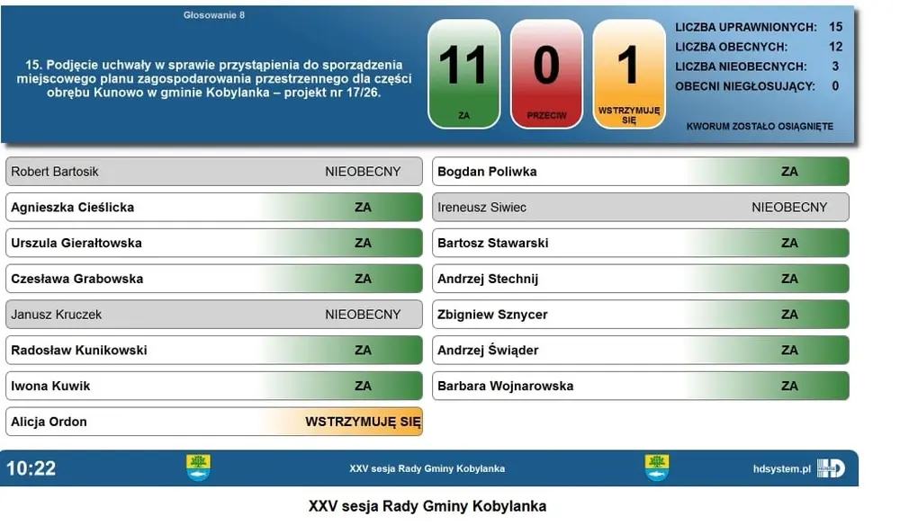 Ostatecznie za przystąpieniem do sporządzenia planu zagospodarowania przestrzennego dla obrębu Kunowo głosowało 11 radnych, od głosu wstrzymała się radna Alicja Ordon.