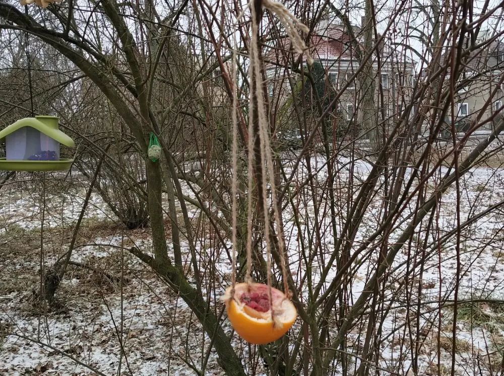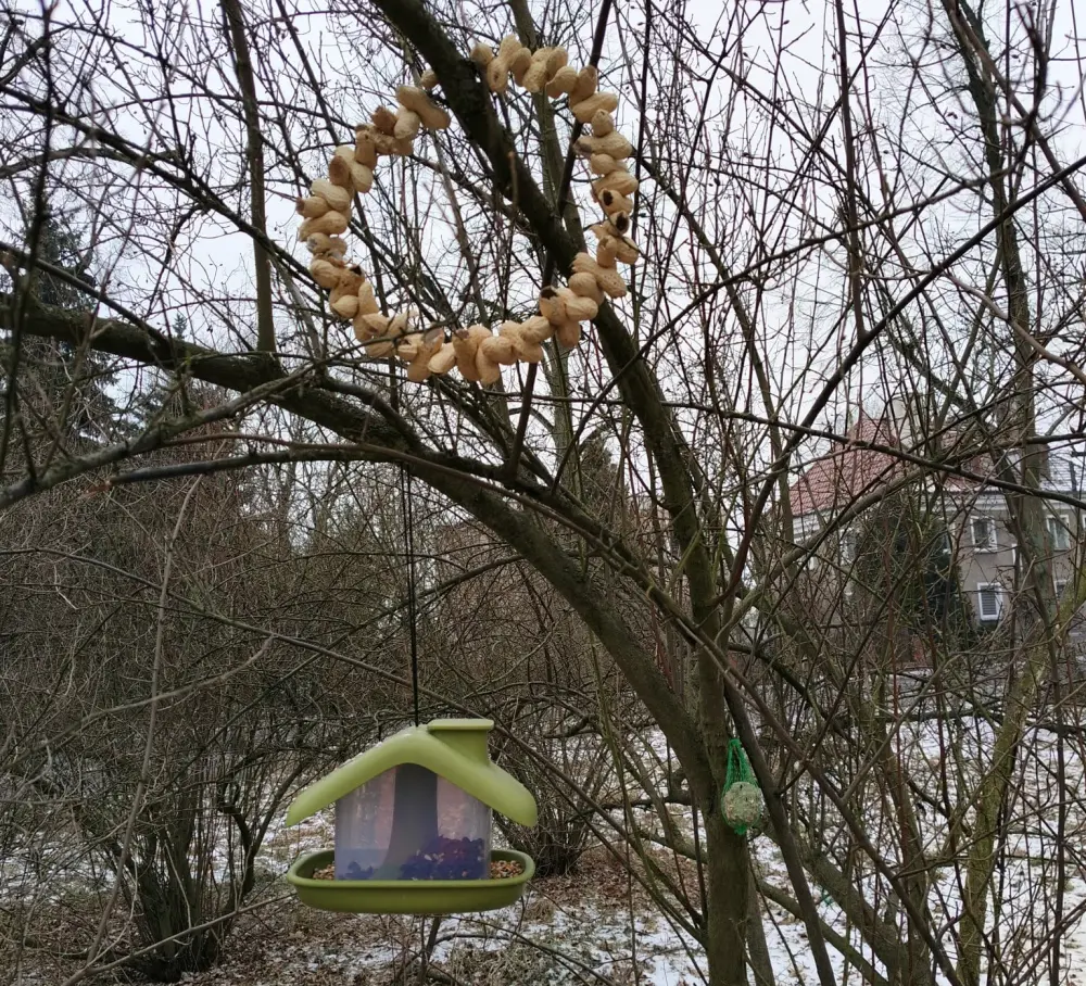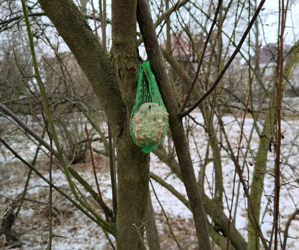 Niskie temperatury, śnieg i ograniczony dostęp do naturalnego pożywienia sprawiają, że wiele gatunków ma problem ze znalezieniem pokarmu. Właśnie dlatego tak ważna jest pomoc człowieka. W ostatnich tygodniach w parku regularnie pojawiają się specjalnie przygotowane zawieszki z pokarmem. Na gałęziach drzew można dostrzec tzw. „ptasie knedle”, czyli kule tłuszczowo-ziarnowe, chętnie odwiedzane przez sikorki, wróble czy kowaliki. Obok nich zawisły również mieszanki ziaren w siateczkach, które stanowią cenne źródło energii w mroźne dni.
